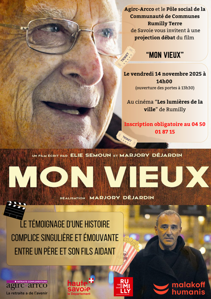 Agirc-Arcco et le Pôle social de la Communauté de Communes Rumilly Terre de Savoie vous invitent à une projection débat du film “MON VIEUX” le vendredi 14 novembre 2025 à 14h00 : le témoignage d'une histoire complice singulière et émouvante entre un père et son fils aidant.
